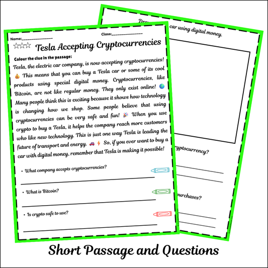 Tesla Accepting Cryptocurrencies | Short Reading Comprehension Creative Worksheet