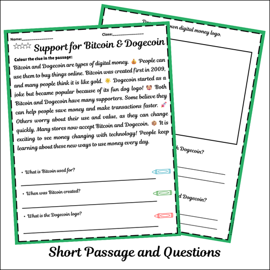 Support for Bitcoin & Dogecoin | Short Reading Comprehension Creative Worksheet