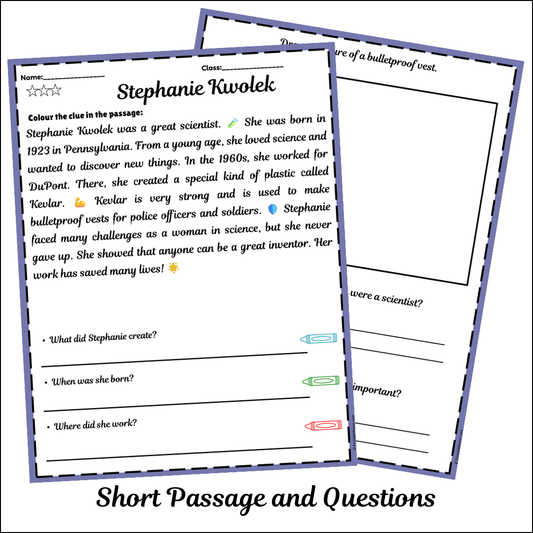 Stephanie Kwolek | Short Reading Comprehension Creative Worksheet