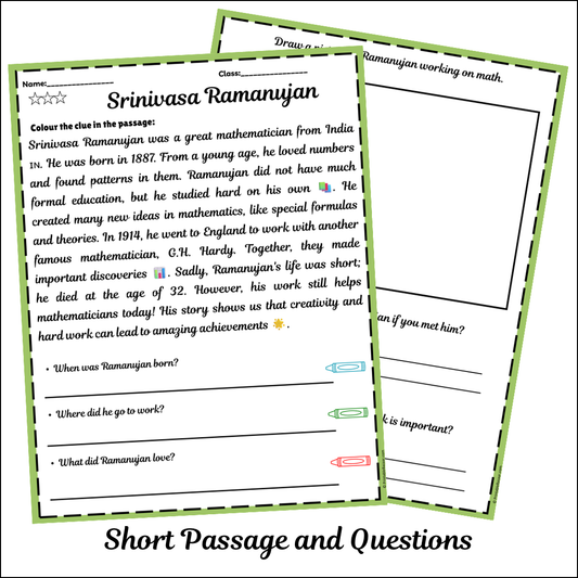 Srinivasa Ramanujan | Short Reading Comprehension Creative Worksheet
