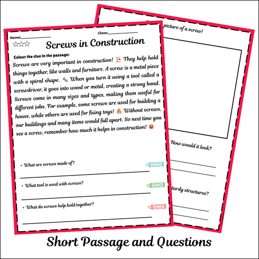 Screws in Construction | Short Reading Comprehension Creative Worksheet