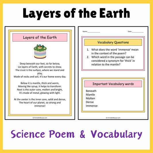 Layers of the Earth | Science Poem Reading Comprehension Activity