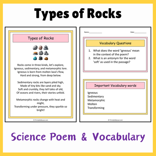 Types of Rocks | Science Poem Reading Comprehension Activity
