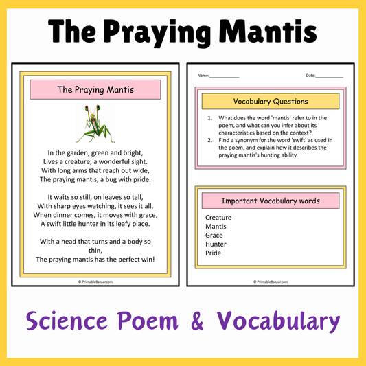 The Praying Mantis | Science Poem Reading Comprehension Activity