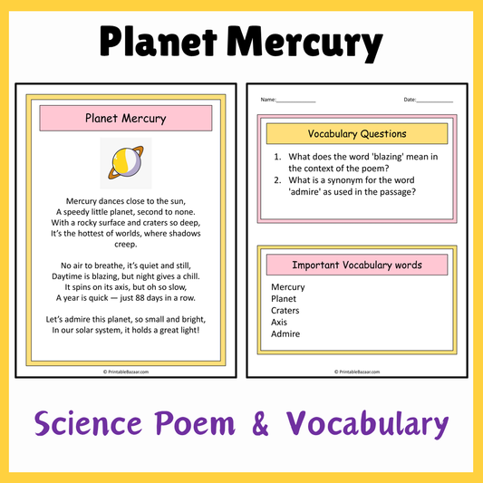 Planet Mercury | Science Poem Reading Comprehension Activity