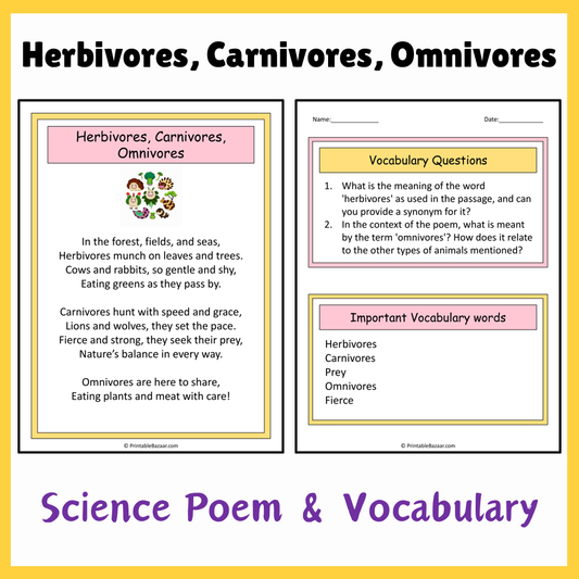 Herbivores, Carnivores, Omnivores | Science Poem Reading Comprehension Activity
