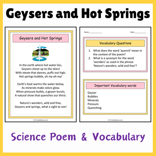 Geysers and Hot Springs | Science Poem Reading Comprehension Activity
