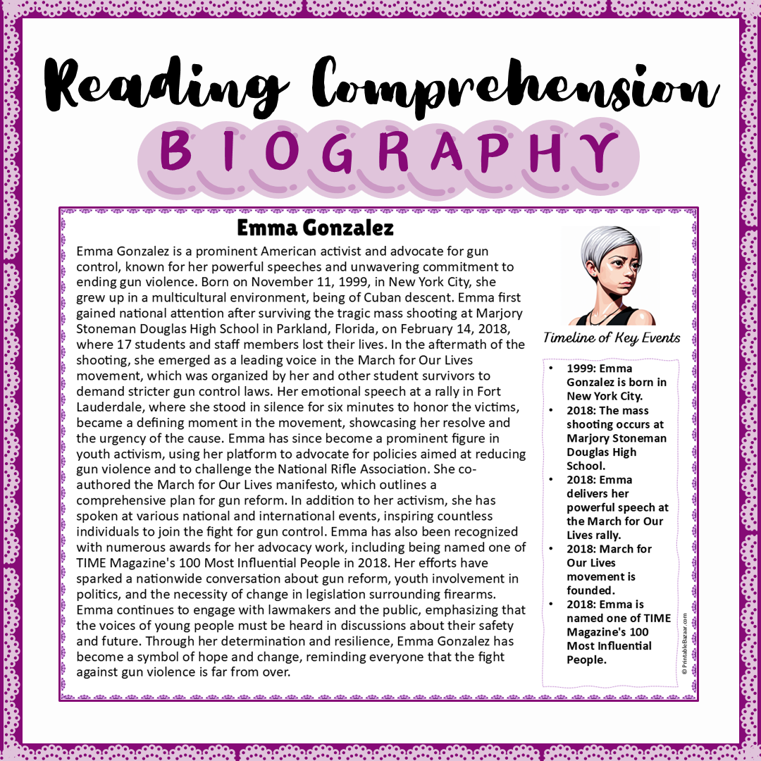 Emma Gonzalez | Biography Reading Comprehension and Questions Worksheet