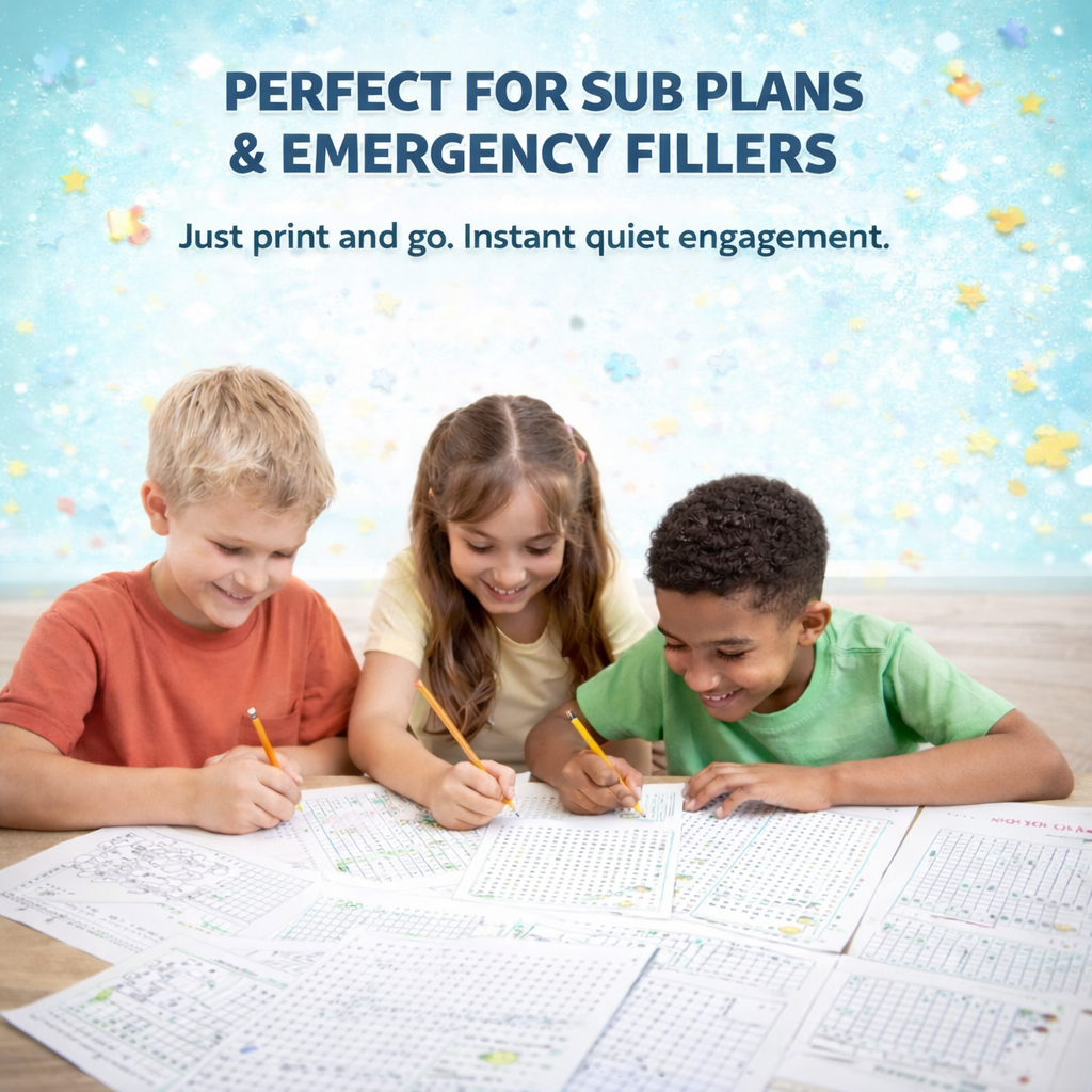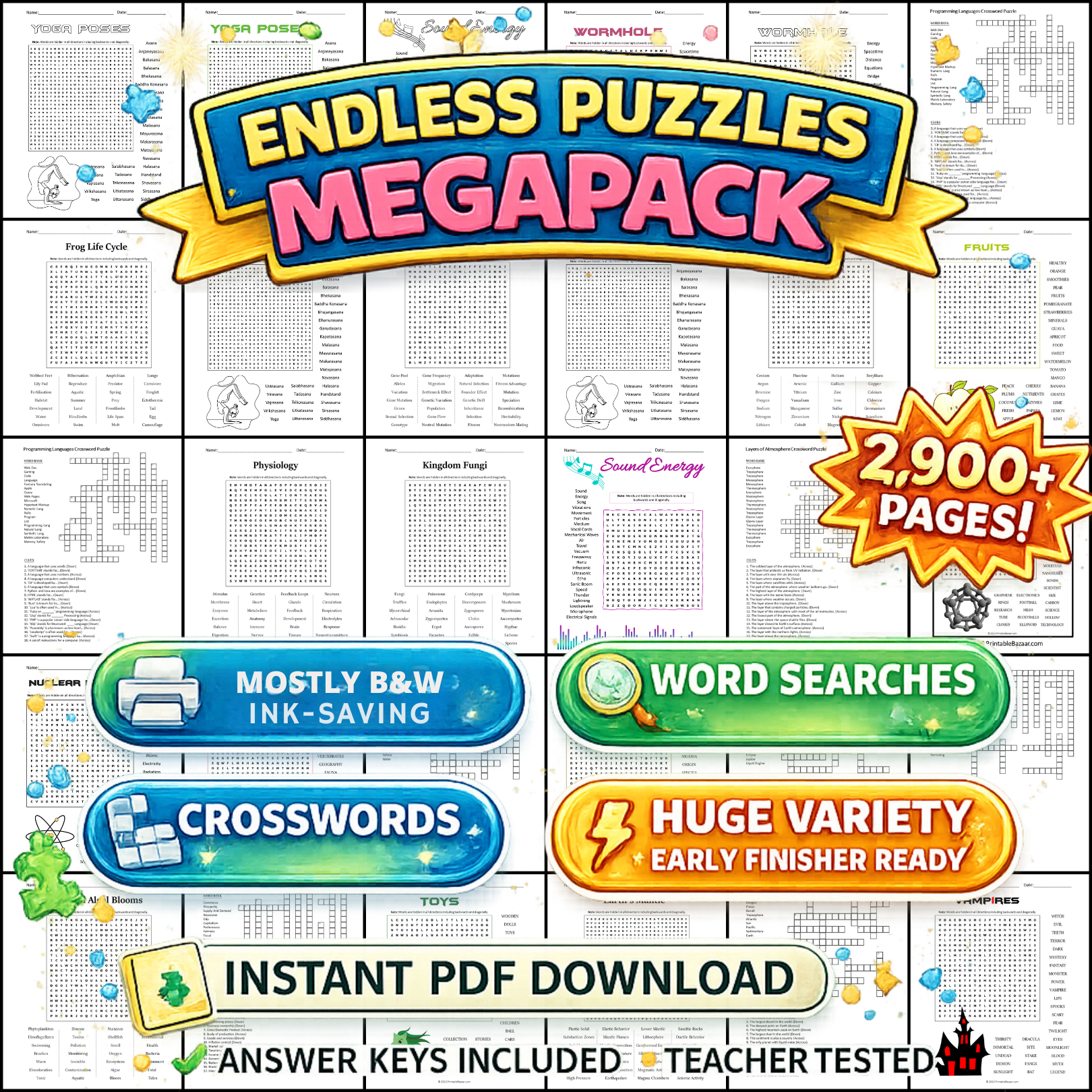 The Endless Puzzles Megapack is your massive library of literacy-building puzzles. With over 2,900+ pages of Word Searches and Crosswords covering almost every topic imaginable, you will never have to scramble for filler work again.