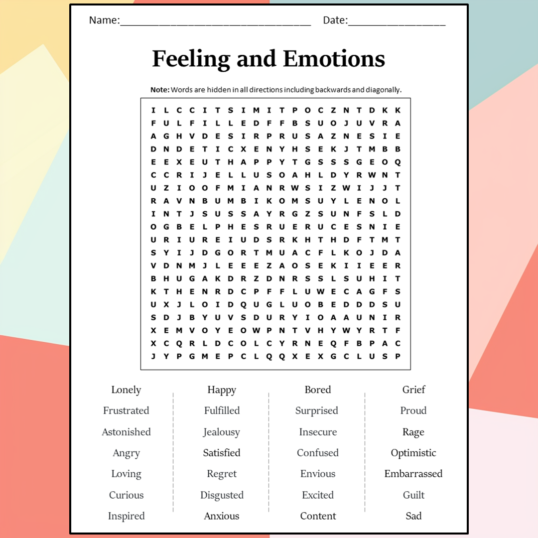 A fun and engaging word search puzzle that delves into the captivating world of Feeling And Emotions.