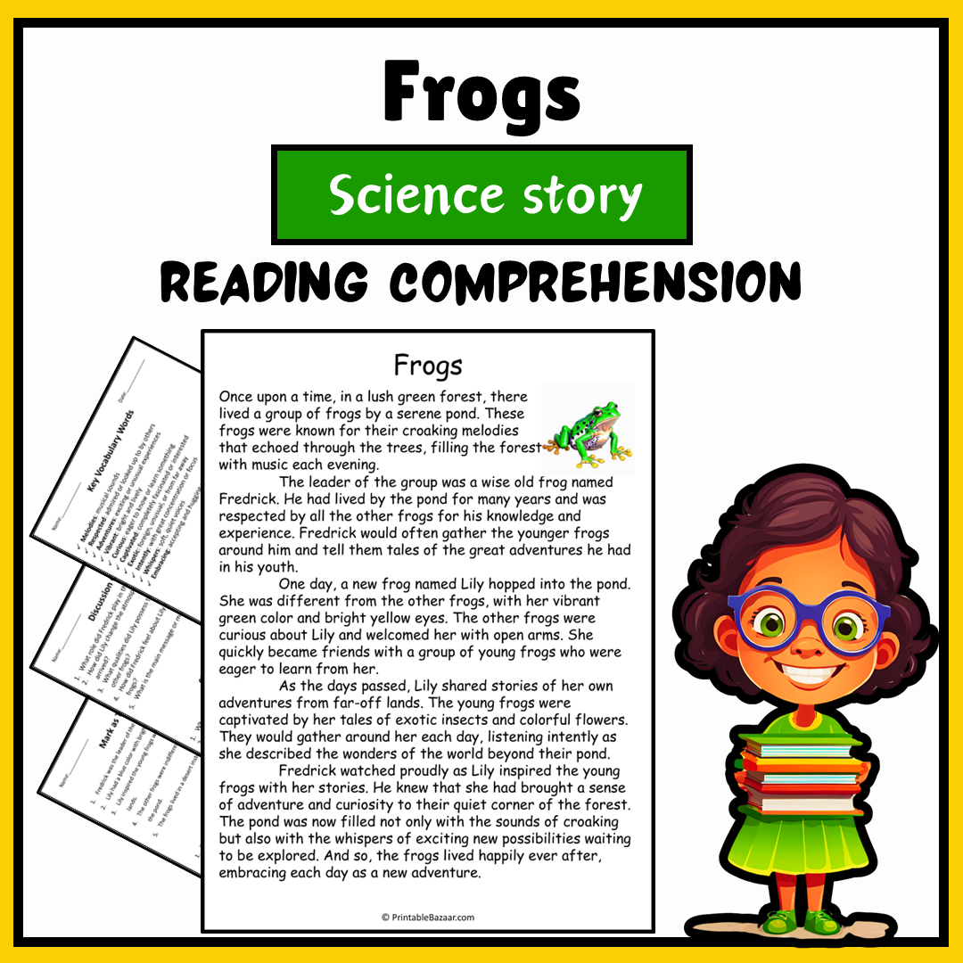 - Engaging Reading Passage: A captivating story about the frogs of a serene pond.