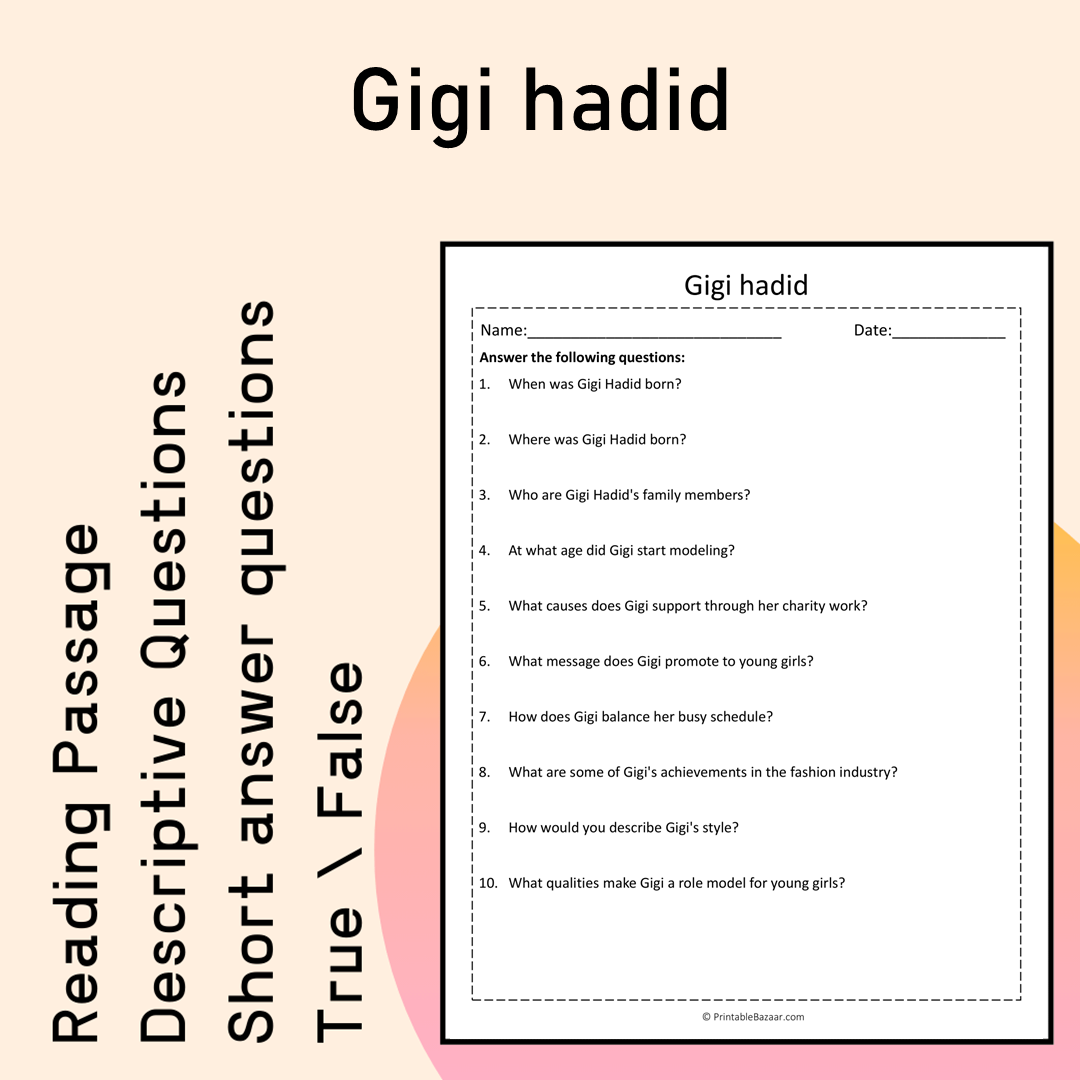 These worksheets are not just about Gigi Hadid; they're an opportunity to inspire young minds! Each feature has been designed with learning outcomes in mind. For example, the descriptive questions encourage learners to think critically about Gigi's life, while the true/false questions help them recall important facts like Gigi being born on April 23, 1995, and her belief that beauty comes in all shapes, sizes, and colors. 💪🏽 By engaging with this content, students can improve their comprehension skills while exploring the life of a role model who promotes positivity and self-acceptance.