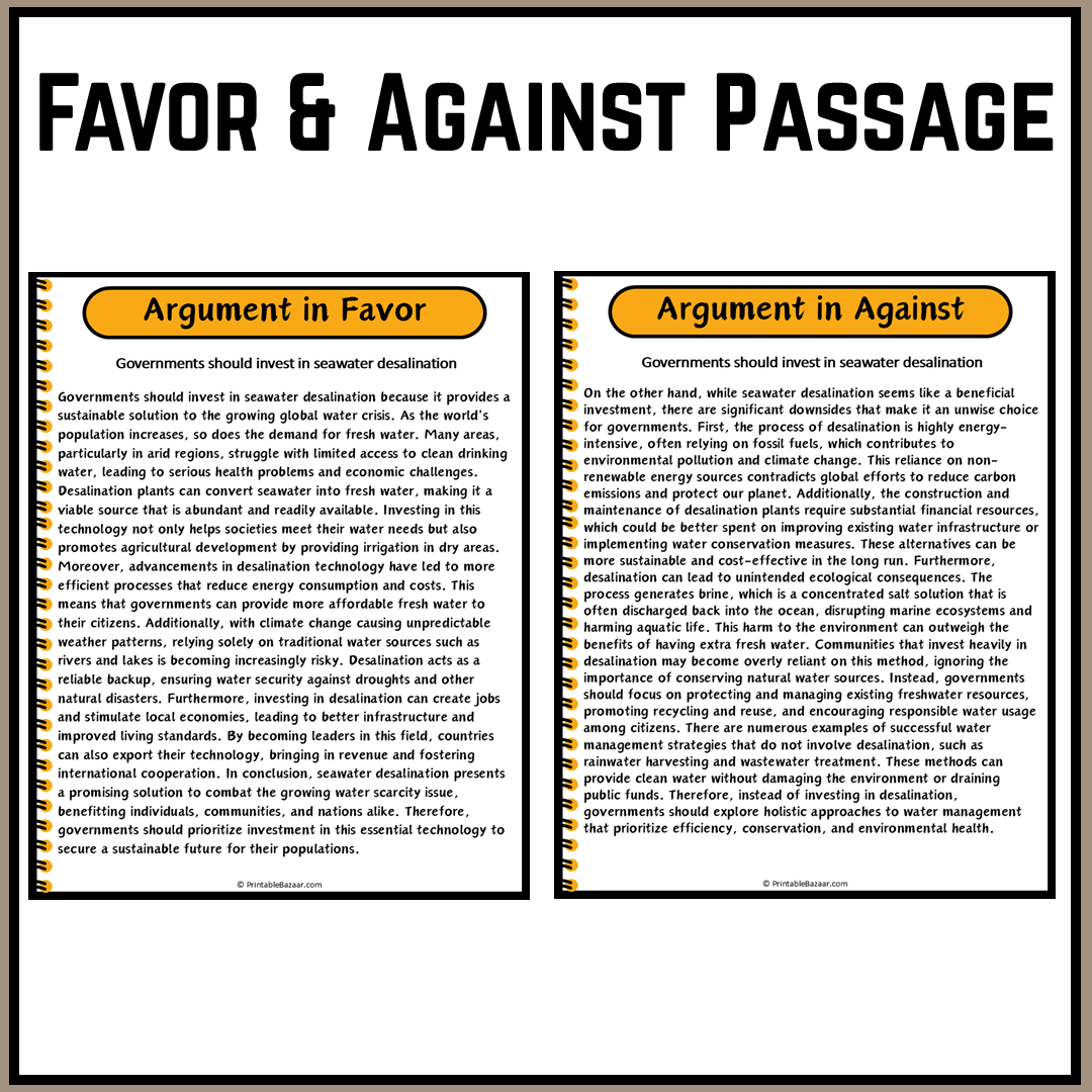 Unlock the intrigue of one of today's hottest environmental debates with our comprehensive digital worksheet on the topic, "Governments Should Invest in Seawater Desalination". This engaging resource is designed to help learners explore the complexities surrounding desalination technology as a potential solution to the global water crisis. With increasing populations and dwindling freshwater sources, understanding both sides of the argument is vital for future decision-makers. 🌍💧