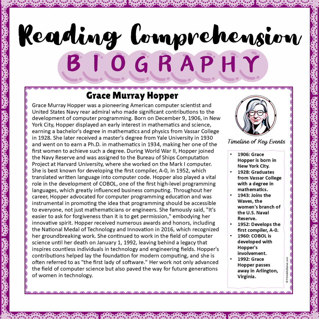 Grace Murray Hopper | Biography Reading Comprehension and Questions Worksheet