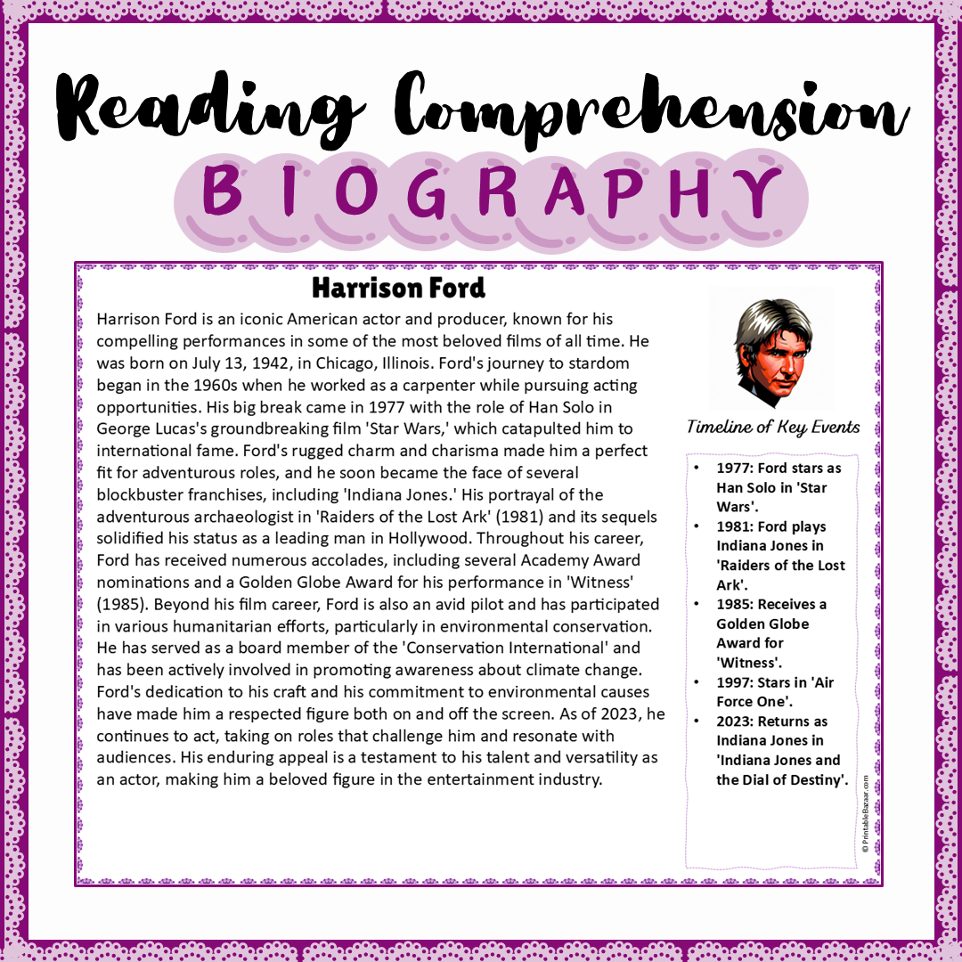 Harrison Ford | Biography Reading Comprehension and Questions Worksheet