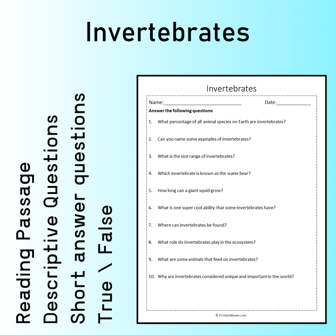 Invertebrates | Reading Comprehension Passage Printable Worksheet