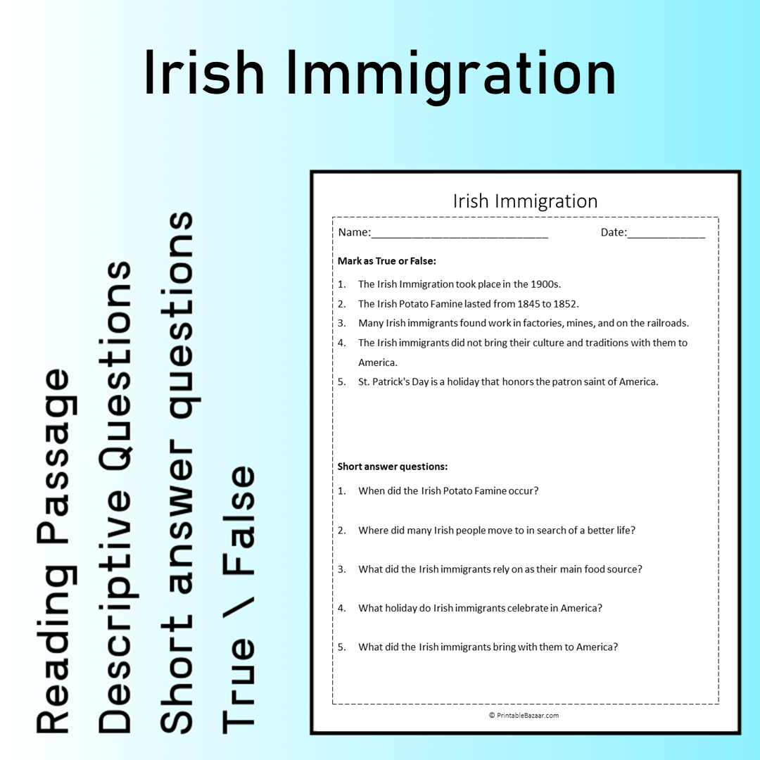 Irish Immigration | Reading Comprehension Passage Printable Worksheet