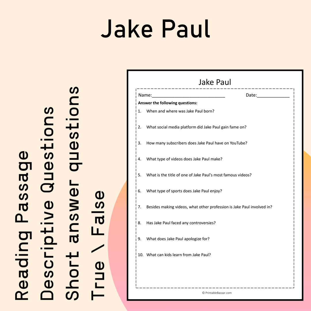 Jake Paul | Reading Comprehension Passage Printable Activity