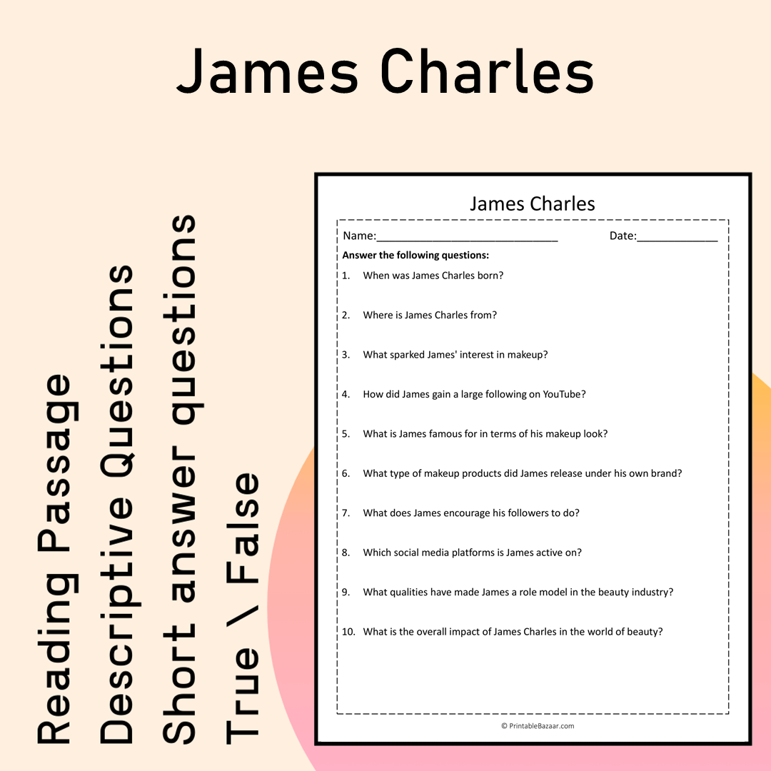 Are you ready to dive into the fabulous life of James Charles? Our engaging digital worksheet not only explores the artistry of this renowned makeup artist and internet sensation but also boosts your reading comprehension skills! With a captivating reading passage about James's journey, creative makeup techniques, and inspiring messages, this worksheet is designed to inform and entertain learners of all ages. 💄✨