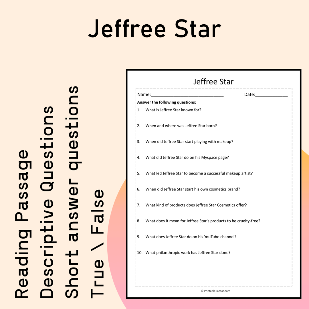 Unleash your creativity and learn all about the vibrant life of Jeffree Star with our engaging digital worksheet! This comprehensive resource is perfect for young learners who want to explore the fascinating journey of a renowned makeup artist and entrepreneur. From his early passion for makeup to his successful cosmetics brand, this worksheet will inspire students to follow their dreams just like Jeffree does. 🌈