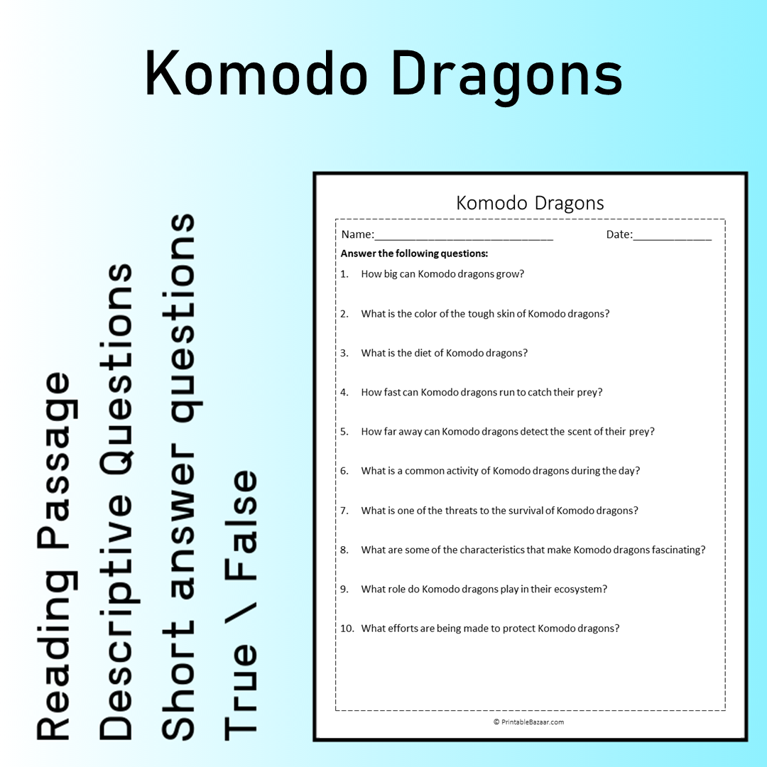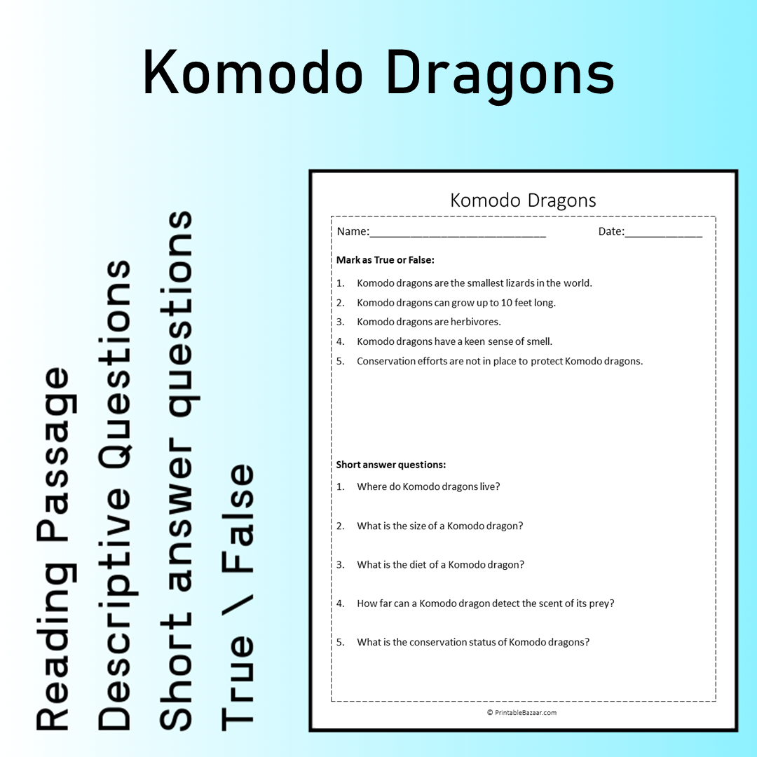 - Reading Passage: An informative text about Komodo dragons, including their habitat, diet, and conservation status.
