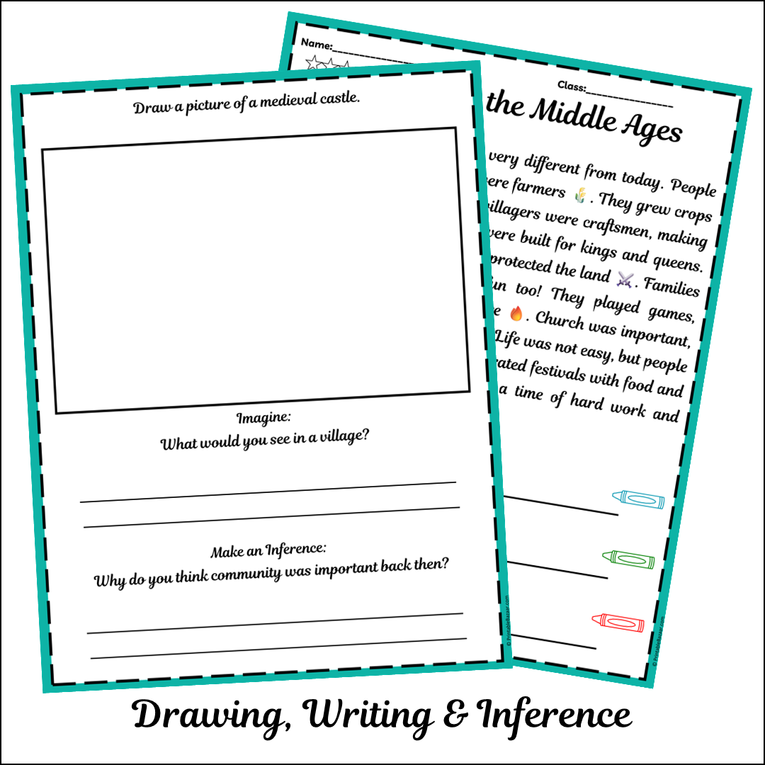 By using our worksheet, learners will delve into various aspects of medieval life. They will see how communities formed strong bonds, as families worked hard together and celebrated festivals filled with food and music. With questions like "Who lived in small villages?" and "What did villagers grow?", students will engage their minds and practice their critical thinking skills. Additionally, the imaginative prompts invite them to envision and draw what a medieval castle might look like, fostering creativity and artistic expression.