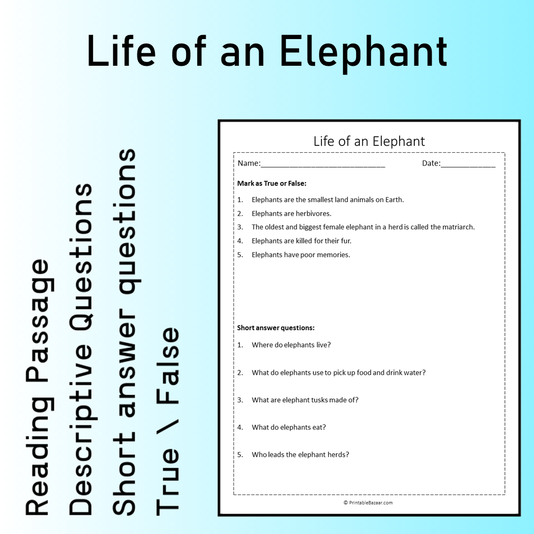 Life of an Elephant | Reading Comprehension Passage Printable Worksheet