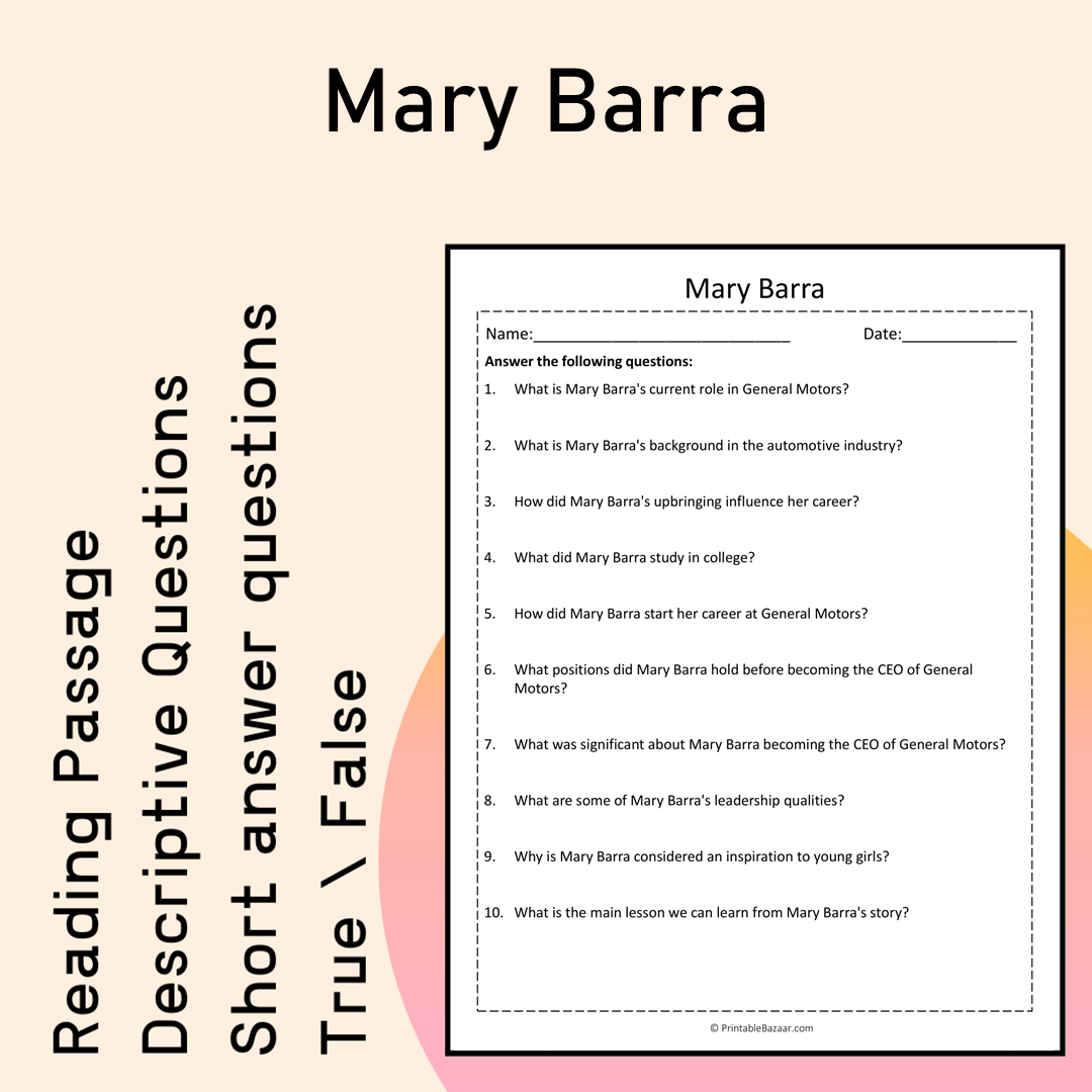 Mary Barra | Reading Comprehension Passage Printable Activity