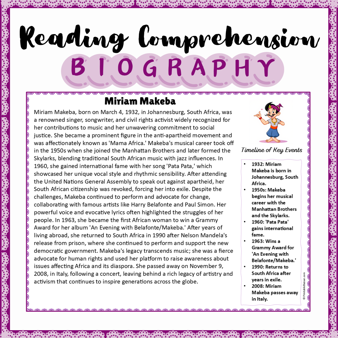 Miriam Makeba | Biography Reading Comprehension and Questions Worksheet