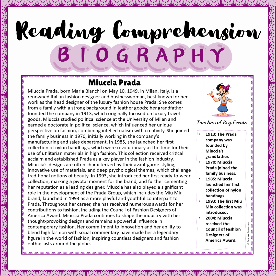 Miuccia Prada | Biography Reading Comprehension and Questions Worksheet