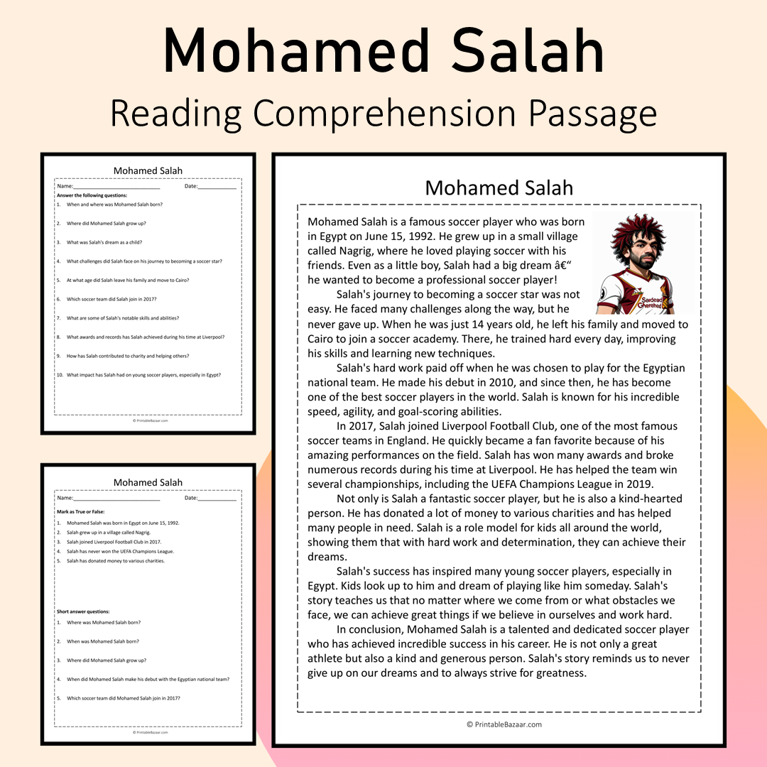 Why choose this worksheet? With its captivating reading passage, students explore not just the facts but the heartwarming journey of Mohamed Salah. They’ll learn about his beginnings in Nagrig and how he overcame various challenges to reach his dreams. For example, did you know that he left his family at just 14 years old to pursue his passion in Cairo? This worksheet is designed to foster a love for reading and inquiry through multiple question formats. 🌟