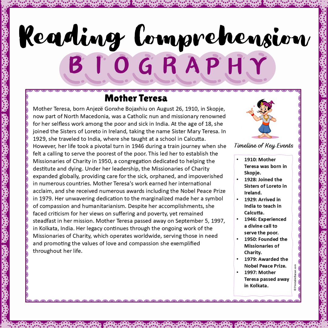 Mother Teresa | Biography Reading Comprehension and Questions Worksheet