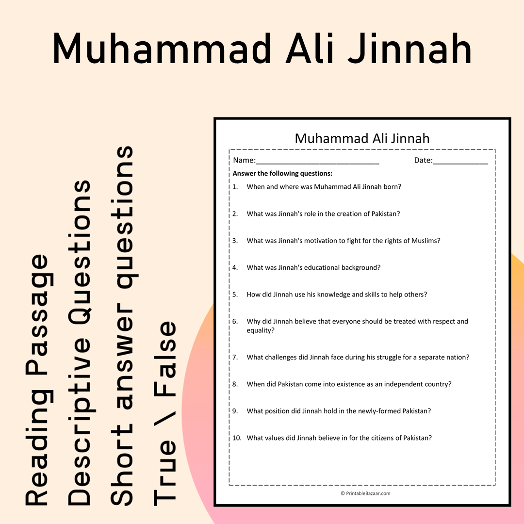Muhammad Ali Jinnah | Reading Comprehension Passage Printable Activity