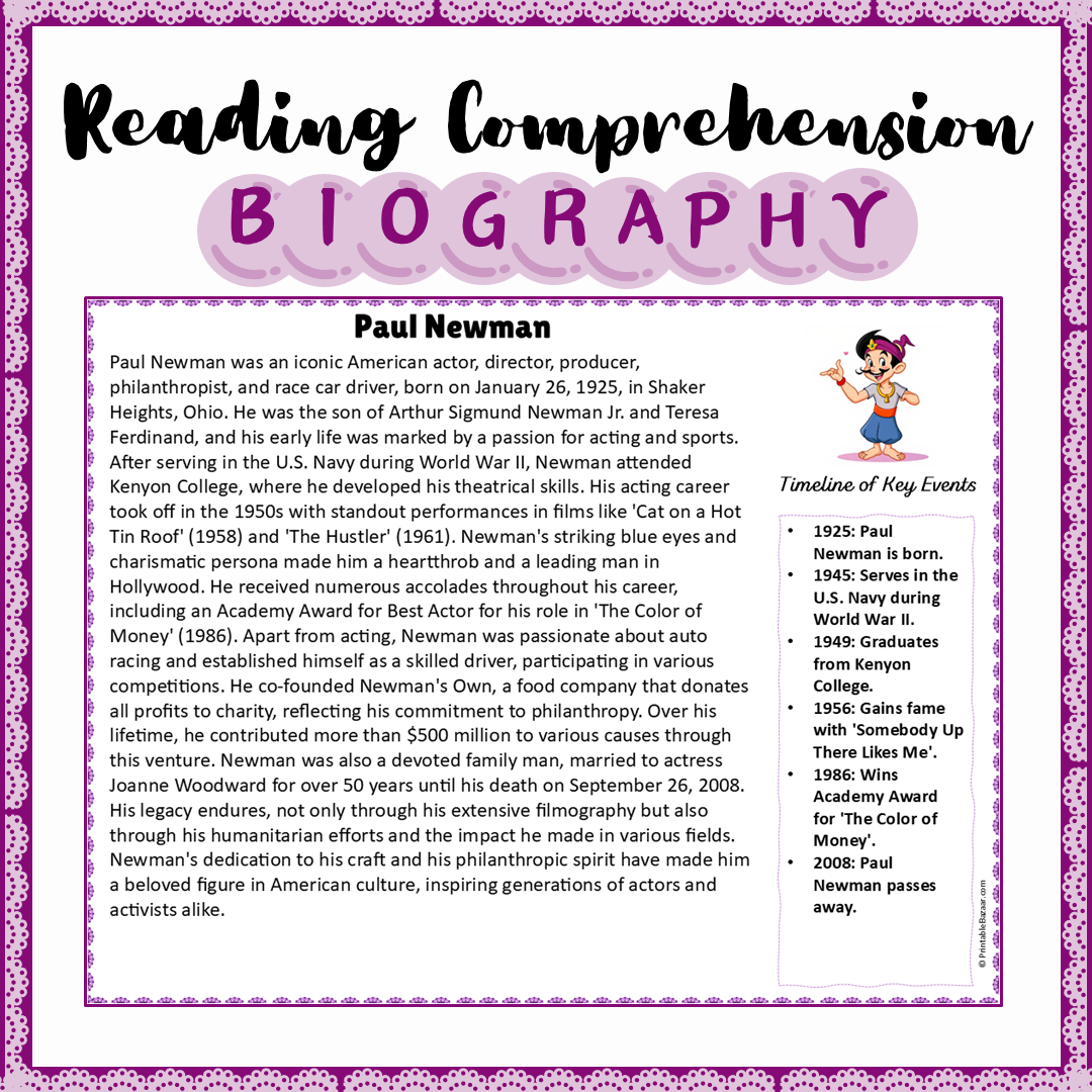 Paul Newman | Biography Reading Comprehension and Questions Worksheet