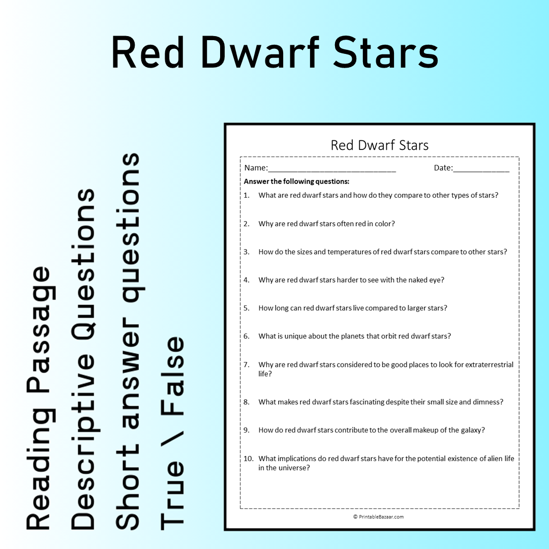 Red Dwarf Stars | Reading Comprehension Passage Printable Worksheet