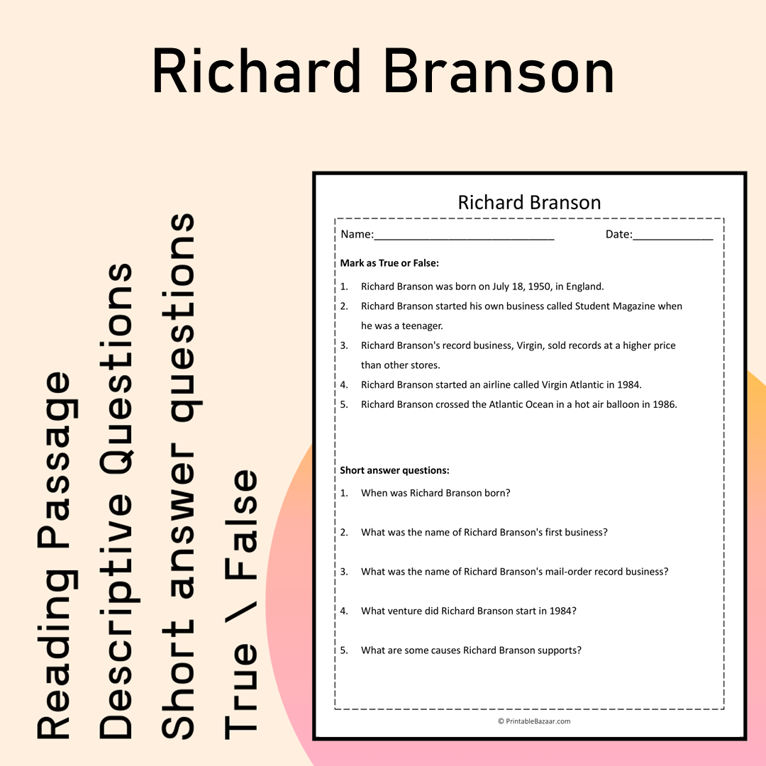 - 📖 Engaging Reading Passage: Learn all about Richard Branson's life and accomplishments, from his early ventures to his thrilling adventures!