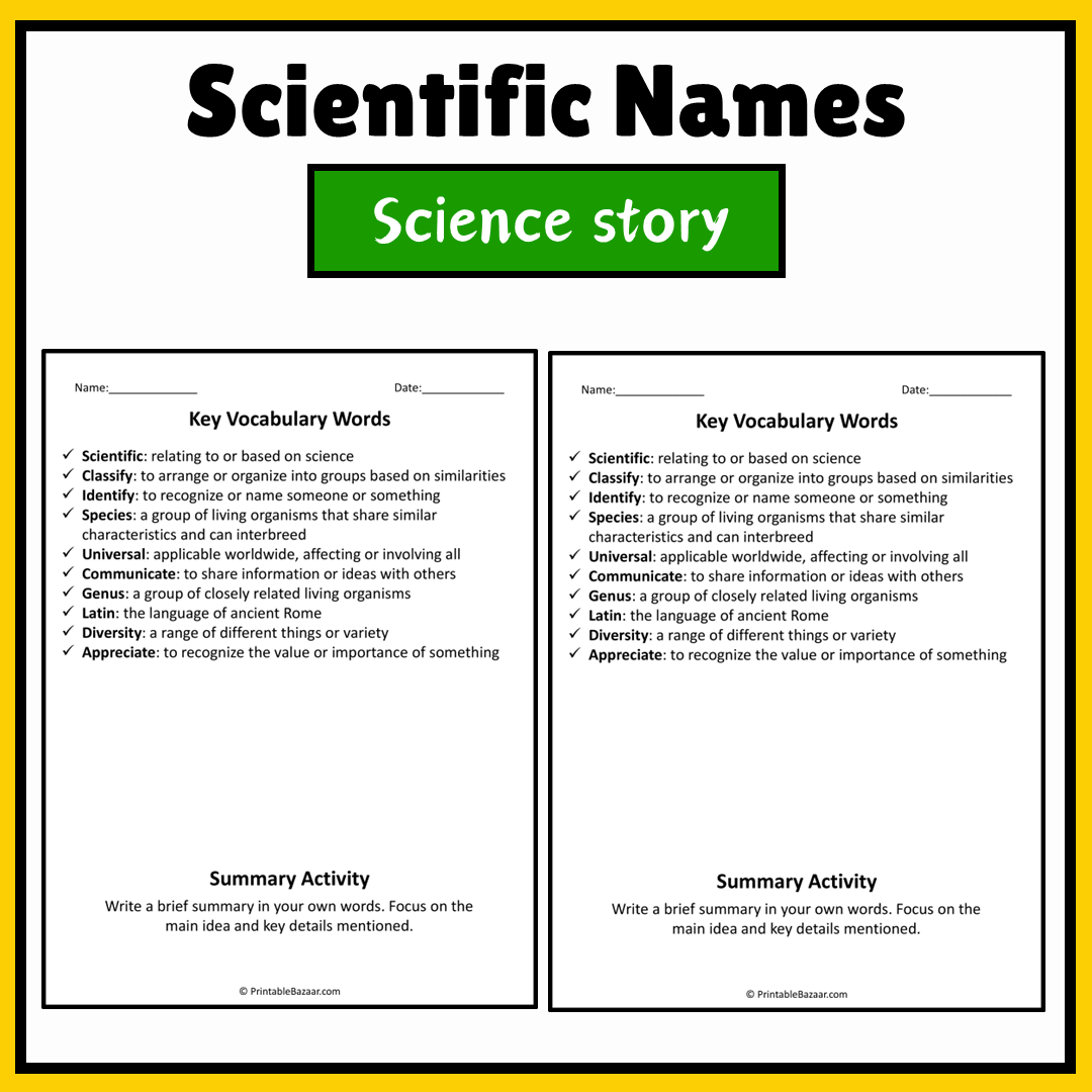 With this worksheet, students not only learn about the importance of scientific names but also engage in critical thinking as they answer questions like: "What are scientific names and why are they important in the field of science?" or “How do scientific names differ from common names in terms of their usage and effectiveness?” 🌍 This cultivates a deeper understanding of biodiversity and encourages learners to appreciate the variety of life around them.
