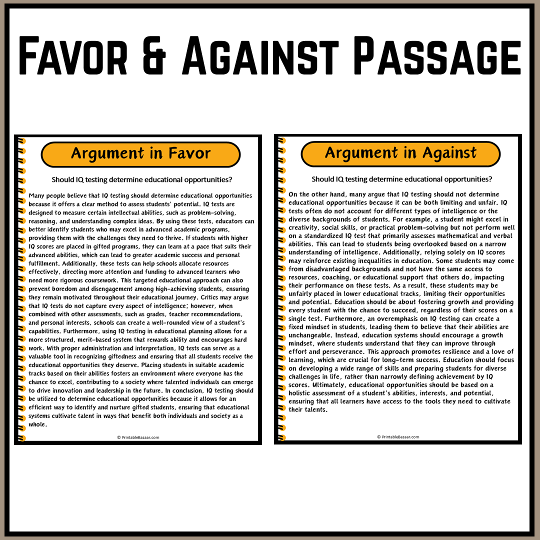 The worksheet's two passages present compelling arguments: one in favor, highlighting how IQ tests can identify academic potential and tailor educational resources for gifted students, and another against, emphasizing the limitations and fairness issues that come with relying solely on IQ scores. For instance, while IQ tests help identify students who may excel academically and need advanced programs, critics argue that these tests can overlook other types of intelligence, like creativity and social skills. 📊