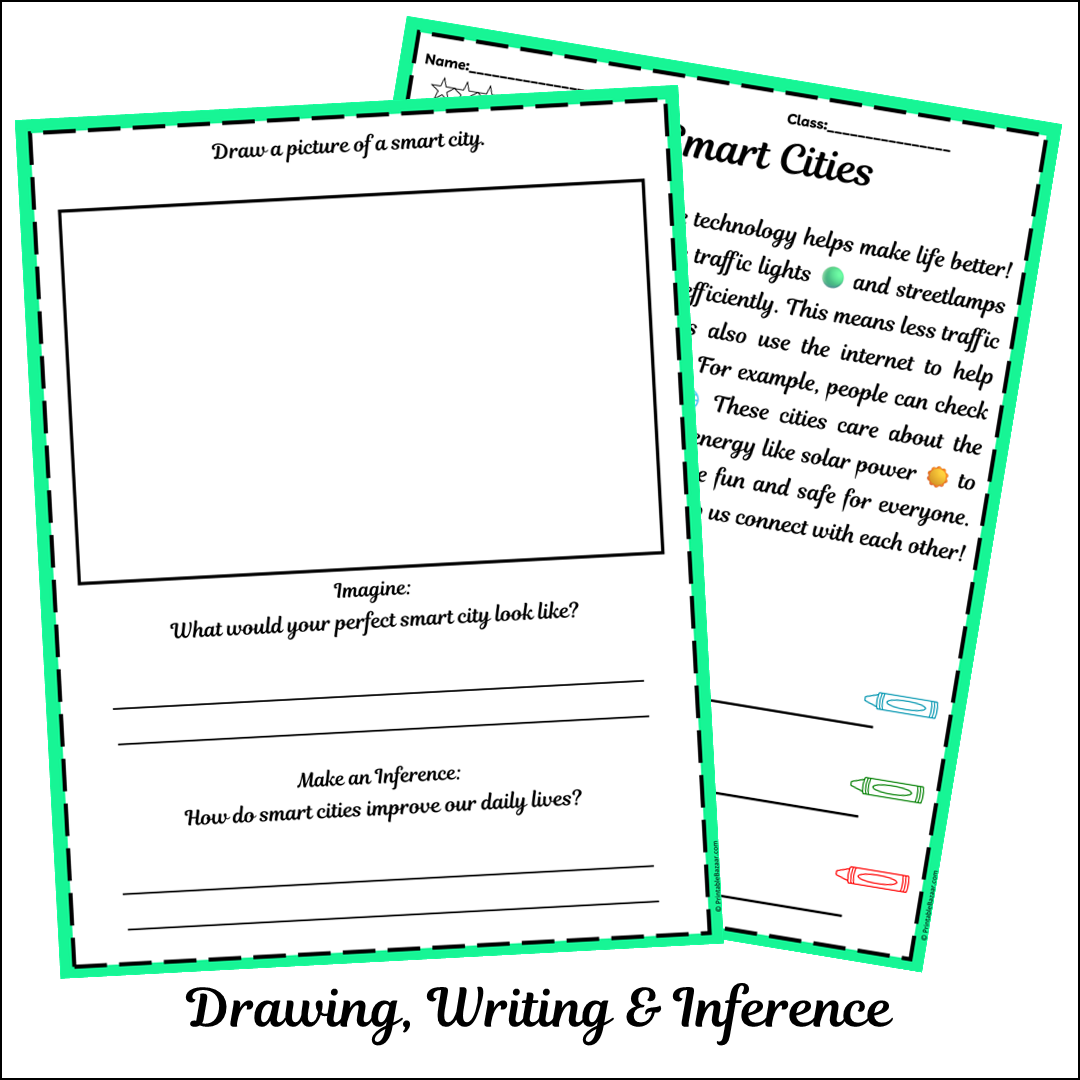 By diving into this worksheet, learners will not only grasp the concept of smart cities but also develop critical thinking skills. Questions like "What is a smart city?" and "What helps with traffic control?" prompt students to reflect on real-world applications of technology. Furthermore, tasks such as imagining their perfect smart city or drawing it out encourage creativity and personal expression.