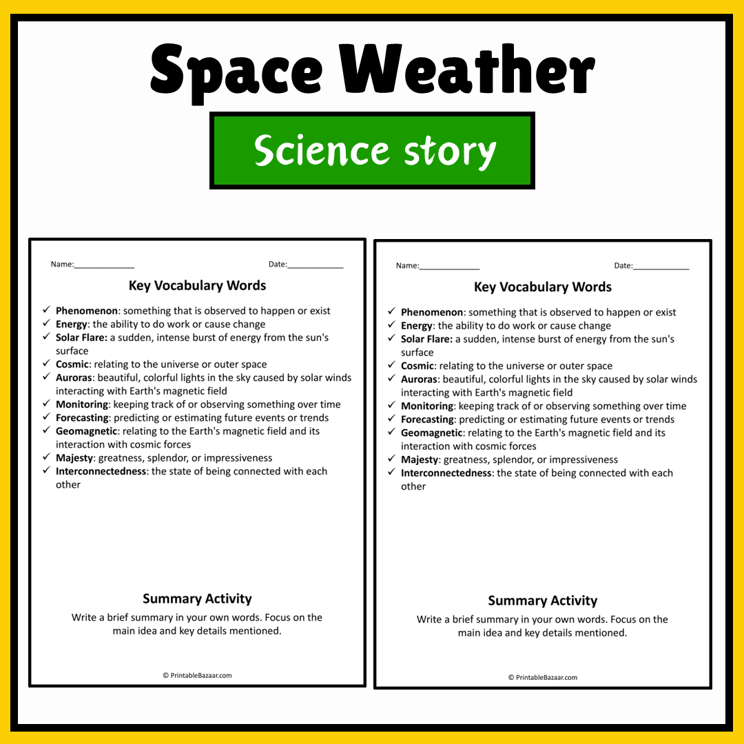 Explore the mysterious and mesmerizing world of space weather with our engaging digital worksheet, "A Day in the Life of Space Weather." This worksheet is designed to captivate young minds and spark curiosity about the cosmic phenomena that influence our planet. From solar flares to breathtaking auroras, students will discover how space weather affects life on Earth and beyond, all while enhancing their reading and comprehension skills! 🚀✨