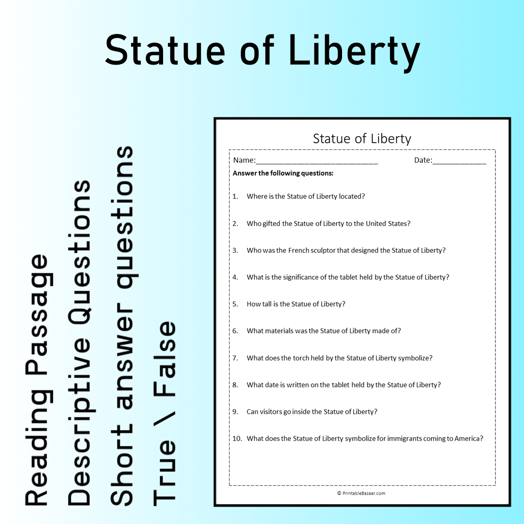 - Reading Passage: An informative text about the Statue of Liberty and its significance.
