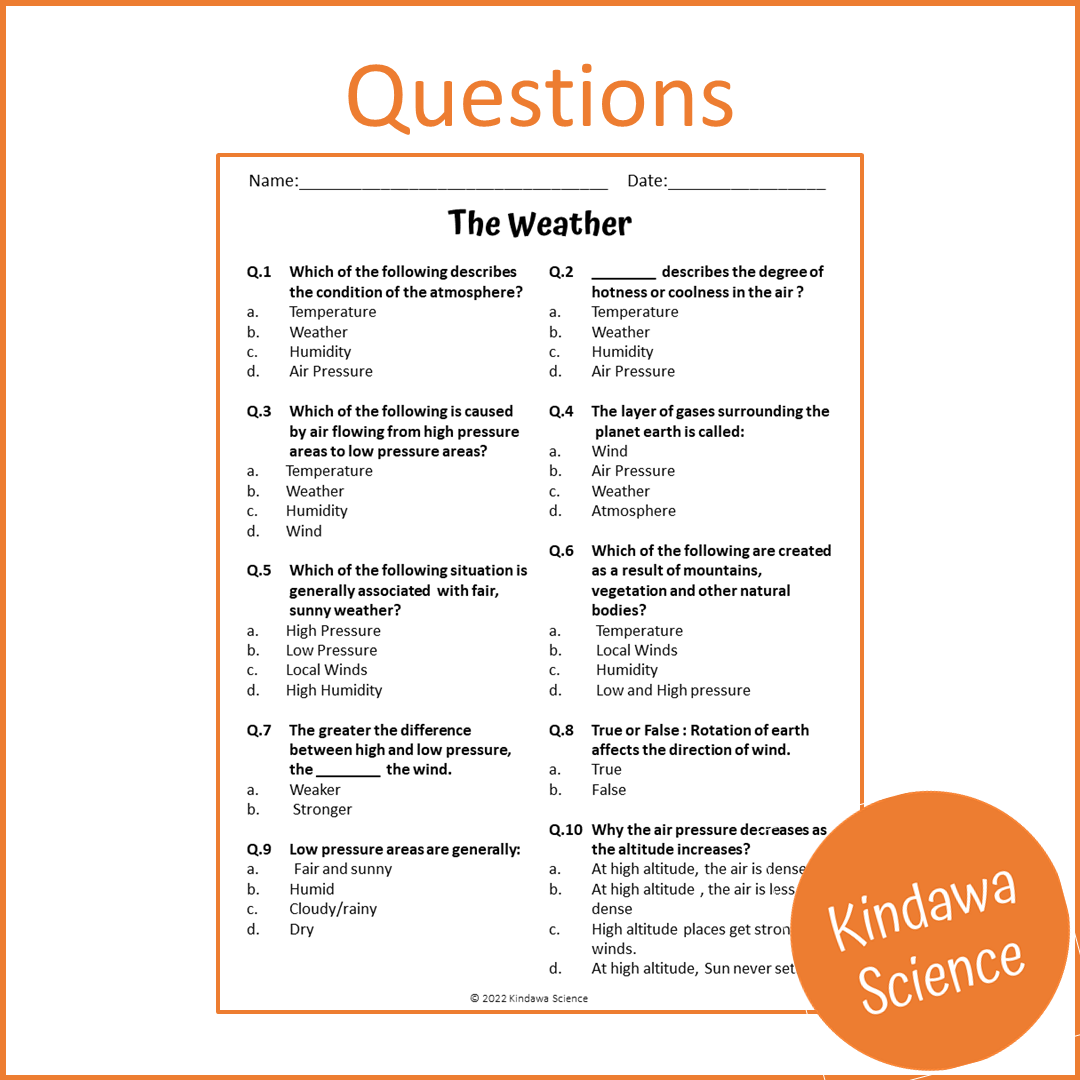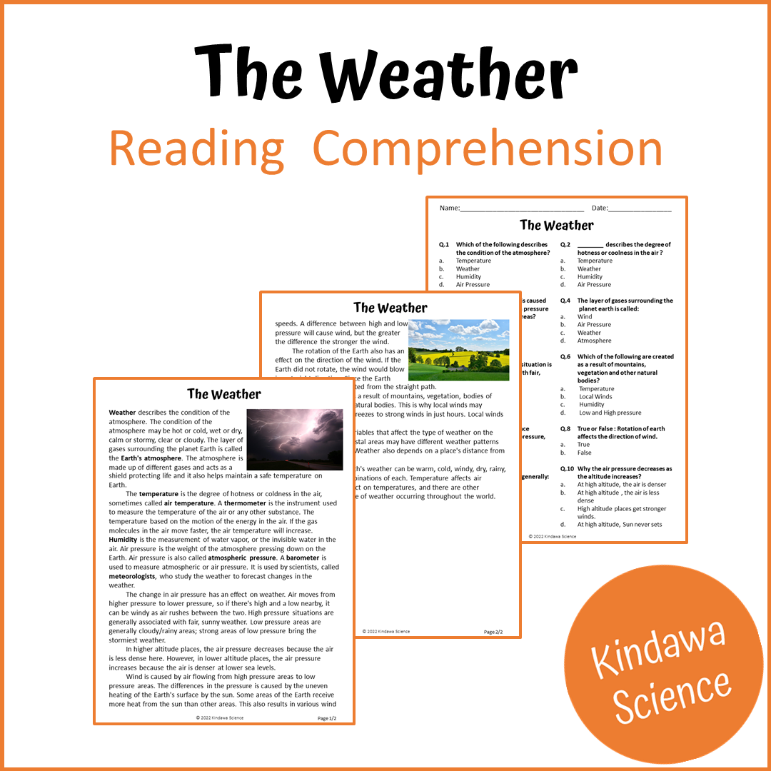 This reading comprehension passage is about The Weather. Through this passage students will learn about questions like: What is weather? What is thermemeter and barometer used for? WHat is humidity? WHo are meteorologists? How does earth's rotation affect the weather?