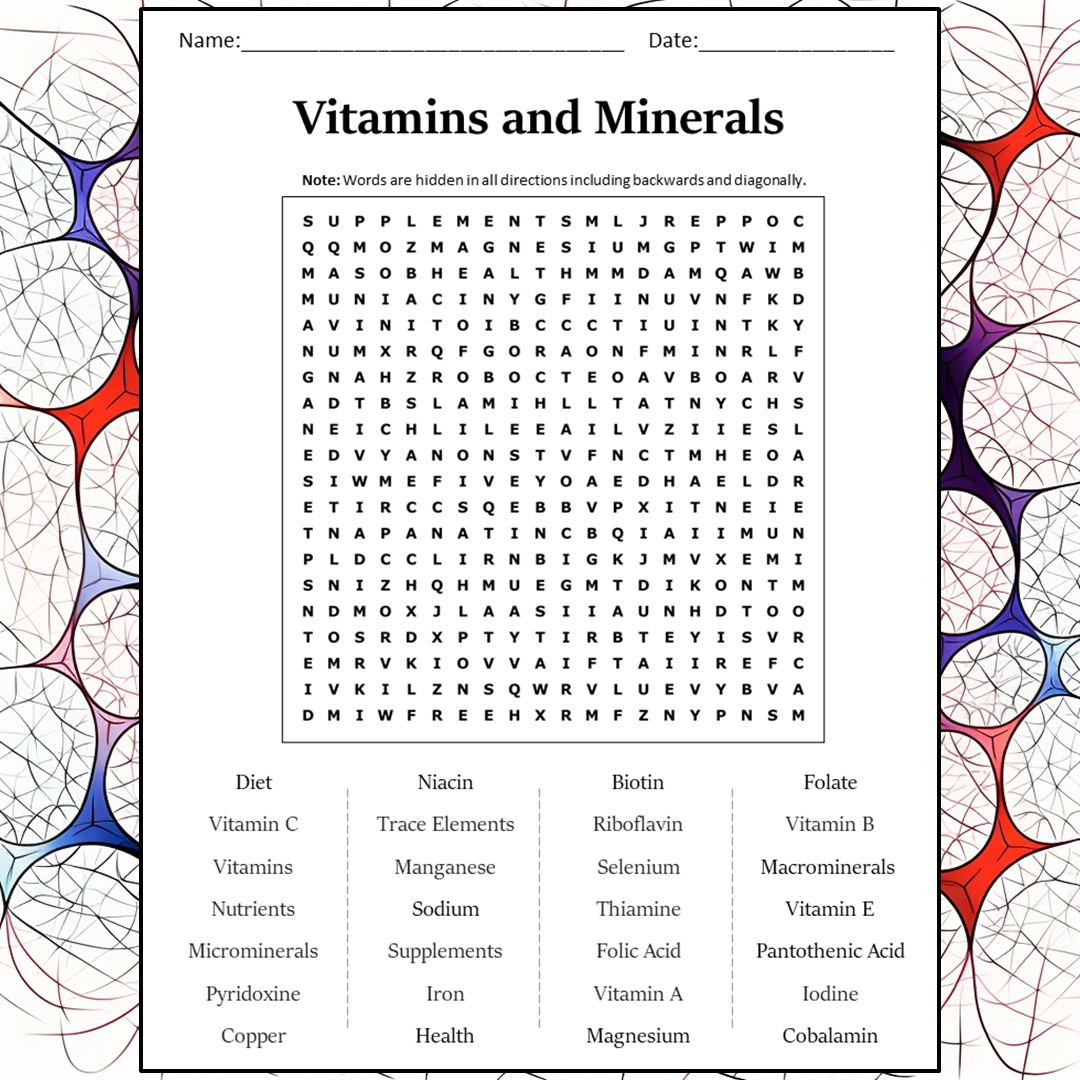 A fun and engaging word search puzzle that delves into the captivating world of Vitamins And Minerals.